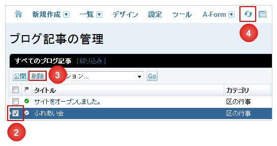 1.前項「4-4.ブログ記事を変更する」の1~2と同様の操作を行い、「ブログ記事の管理」画面を表示します。