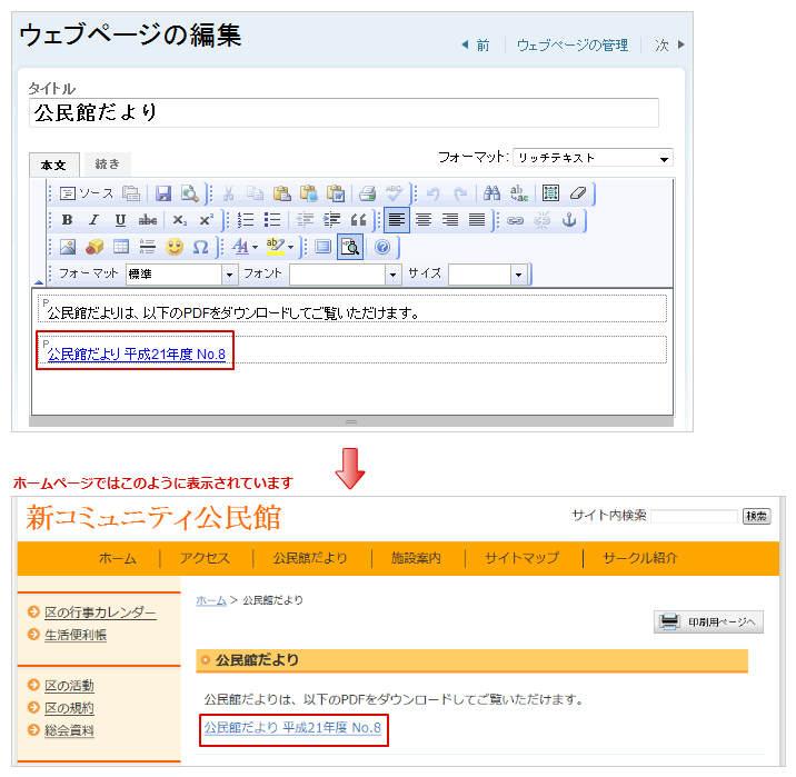 定期的に発行している「公民館だより」を、ホームペ-ジに掲載します。公民館だよりを掲載するには、ホームページの上部メニューまたはサイドメニューに「公民館だより」のメニューが表示されていることが前提となります。
