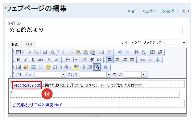 16.「保存」ボタンを押して、ホームページに挿入した「公民館だより」が表示されていることを確認します。